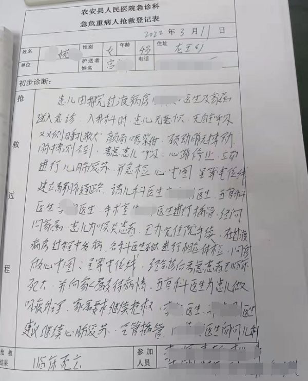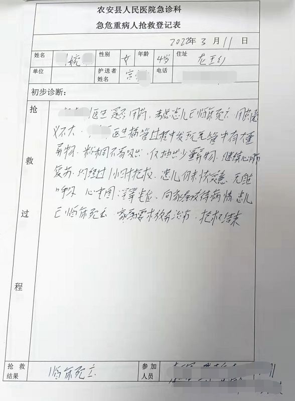 3月11日,因喉炎问题,家属带着小婉君前往吉林省长春市农安县人民医院就医,期间根据要求做了核酸检测。但从14点21分家属带着小婉君到科室就诊,到16点40分家长发现小婉君情况不对向医生求救这两个多小时期间,家属根据医护人员的指示,带着孩子在五官科、发热门诊、过渡病房等几个地点来回移动,却始终没有得到确实的救治。