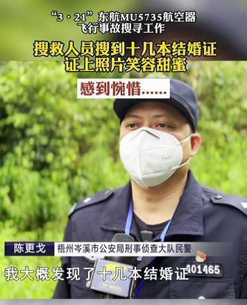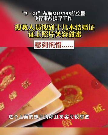 3月30日,据南宁广播电视台报道,在“3·21”东航MU5735航空器飞行事故现场,搜救人员在坠机现场发现十几本结婚证 。