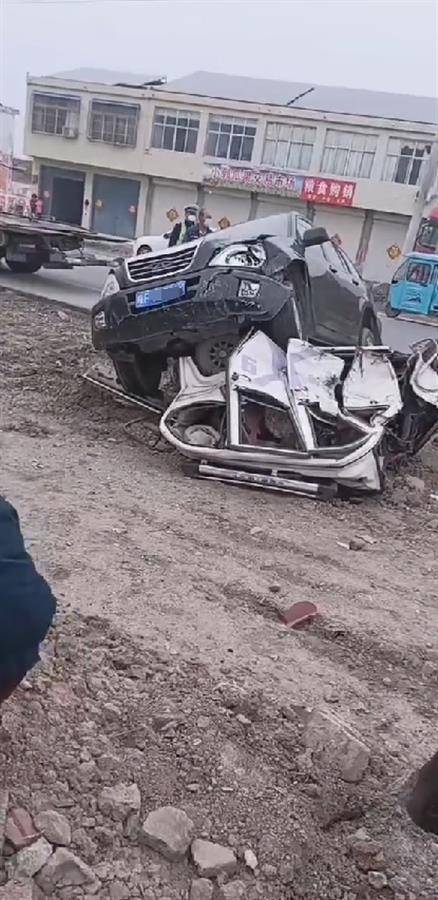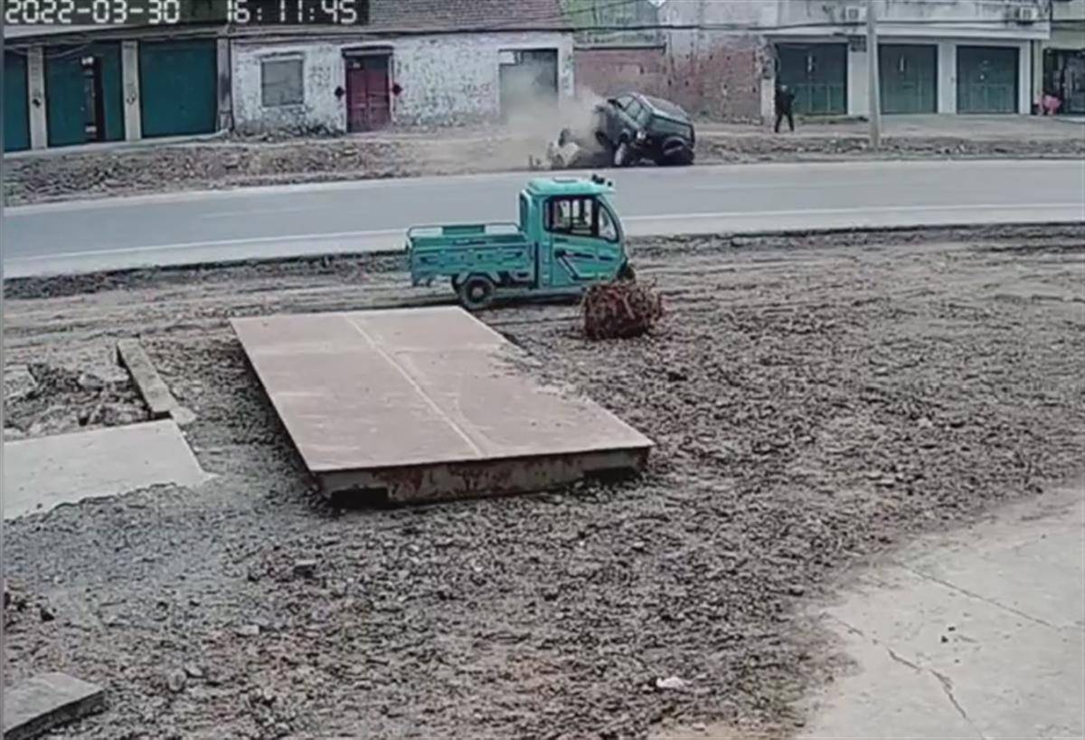 另一段视频显示,黑色越野车半个车身都骑在了白色电动三轮车上,白色电动三轮车几乎已经解体,事发后有民警赶到现场处置。