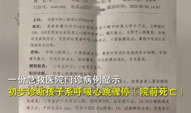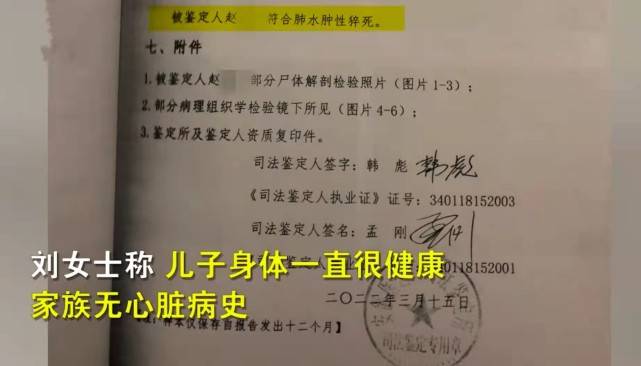 医院的病历显示,孩子符合肺水肿性猝死,可以排除他的肝肾、心脏的病理,刘女士声称孩子的身体一直很健康,家族没有心脏病史。