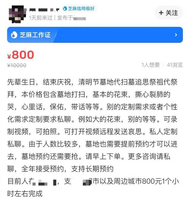 清明“代哭”服务收费上千,“清明节,北京地区墓地代扫”“扬州清明代扫,可以代买祭品”……据报道,清明节临近,各网购、社交平台上提供有偿代扫墓服务的卖家多了起来。