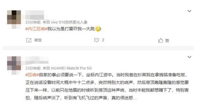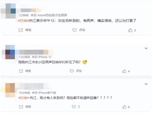 还有网友说自己在拿碗筷准备吃饭的时候,突然特别大的响声,然后房顶轰隆轰隆 的 感觉要压下来一样。当然,也还有市民家中窗户被震裂,这也说明了,这个巨响产生的声音有点大。