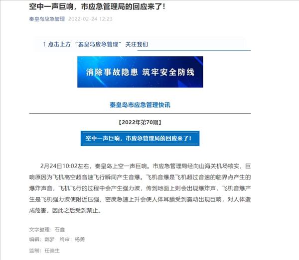 “秦皇岛应急管理”微信公众号发布消息称,市应急管理局经向山海关机场核实,巨响原因为飞机高空超音速飞行瞬间产生音爆。