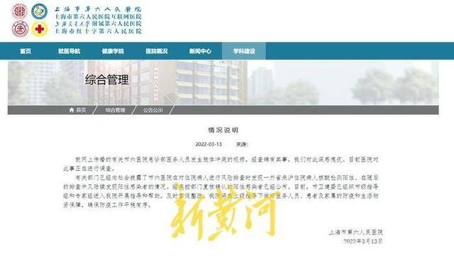 根据相关信息披露,记者了解到,冲突原因系医生让防护措施不到位的护士去病房支援,遭到拒绝。尽管上述说法未得到证实,但也引起了公众对该院管理的担忧。3月13日,有网友留言询问上海市第六人民医院的具体情况。对此,上海市政务新媒体“上海发布”回应:六院在常规筛查中发现了阳性感染者。在后续排查中,又发现有感染者。市卫健委已组织市级指导组和专家组进入医院开展指导和帮助,同时做好防疫和生活物资保障。