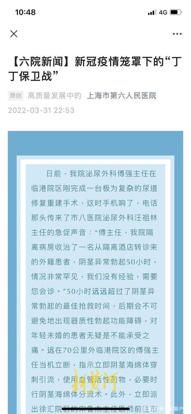 该文称,在该院泌尿外科主任医师的“远程”指导下,上海市第六人民医院与上海市第八人民医院共同救治了一名来自境外高风险地区的外籍患者。该患者阴茎异常勃起超过50个小时,与镰状细胞贫血关系密切,此类疾病在国内极其罕见。经过全力救治,手术成功,患者康复出院。