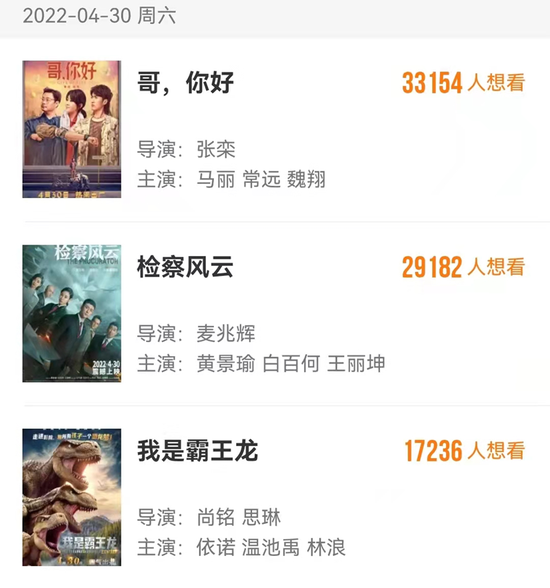 灯塔数据显示,4月份共有28部影片上映。其中,4月15日、4月30日分别将有6部影片上映。