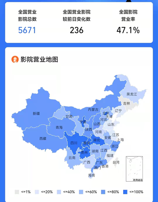 疫情影响下,吉林、上海影院目前均处于关闭状态;山东、江苏影院营业率在5%以下,接近全部关闭;福建、辽宁等省份营业率也在20%以下。在重点票房城市中,深圳、上海、南京等地影院均处于关闭状态。