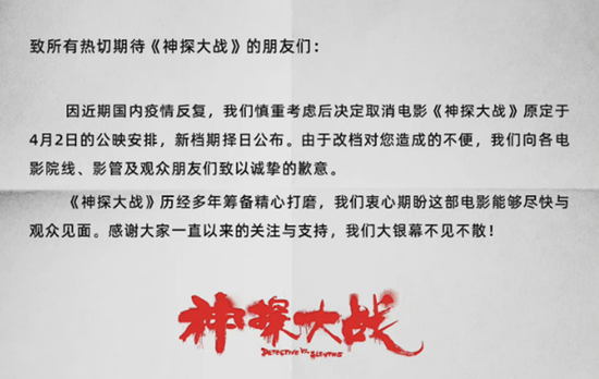 当日,《神探大战》、《你是我的春天》《一周的朋友》等原定于4月2日上映的影片也均发布公告,取消上映计划,新档期择日公布。