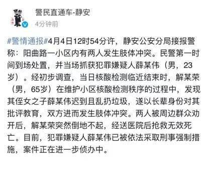 4月4日12时54分许,静安公安分局接报警称:阳曲路一小区内有两人发生肢体冲突。民警第一时间到场处置,并当场抓获犯罪嫌疑人薛某伟(男,23岁)。经初步调查,当日核酸检测临近结束时,解某荣(男,65岁)在维护小区核酸检测秩序的过程中,发现其侄女之子薛某伟迟到且乱扔垃圾,遂以长辈身份对其批评教育,双方进而发生肢体冲突。两人被周边群众劝开后,解某荣突然倒地不起,经送医院后抢救无效死亡。目前,犯罪嫌疑人薛某伟已被依法采取刑事强制措施,案件正在进一步侦办中。