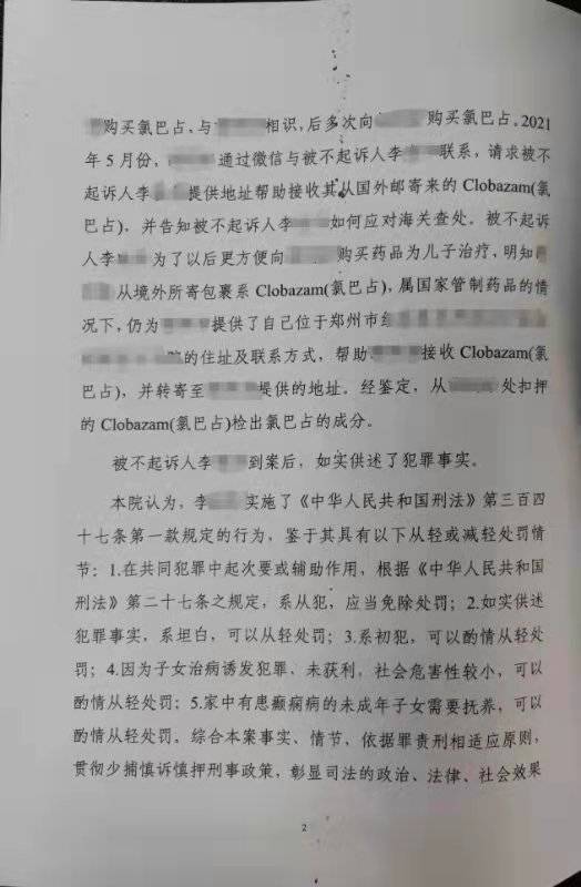 李芳:我跟本地一位妈妈沟通过,但聊得也不多,我们当时都有点避讳这个事。她也不认可这个罪名,但是她也没有申诉。这个事情对她伤害很大,她家里人和周边的人都不理解,认为她一定是干了什么不好的事,家里人认为她不应该帮代购收包裹。后来,她想再给孩子买氯巴占,她亲戚就直接说,不要给孩子吃这个药了,这个药是毒品。我们后来联系得少,不知道现在怎么样了。