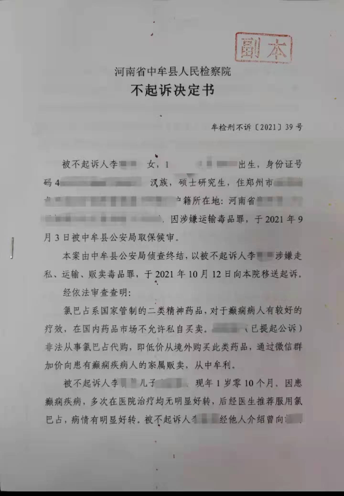 而就在9天前,李芳收到了河南中牟县检察院驳回申诉的材料——去年,因为给病友接收并转寄氯巴占,李芳被指涉嫌“走私、运输、贩卖毒品罪”,相继被警方调查的还有另外三名患儿家属。此后,检方考虑到他们“为子女治病诱发犯罪”,且“未获利”,做出相对不予起诉的决定。
