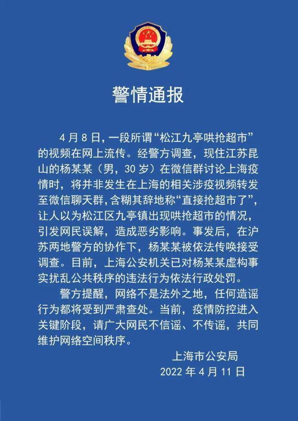 澎湃新闻记者从警方获悉,经警方调查,现住江苏昆山的杨某某(男,30岁)在微信群讨论上海疫情时,将并非发生在上海的相关涉疫视频转发至微信聊天群,含糊其辞地称“直接抢超市了”,让人以为松江区九亭镇出现哄抢超市的情况,引发网民误解,造成恶劣影响。事发后,在沪苏两地警方的协作下,杨某某被依法传唤接受调查。目前,上海公安机关已对杨某某虚构事实扰乱公共秩序的违法行为依法行政处罚。