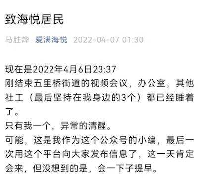 他发在社区公众号“爱满海悦”上的文章,记录了4月6日23时左右这位居民区书记的真实感受。“刚刚结束街道的视频会议,办公室里其他社工(最后坚持在我身边的3个)都已经睡着了。只有我一个,异常清醒。”马胜晔说,这篇文章有可能是自己作为“公众号小编”的最后一篇文章了。