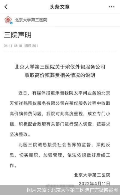 北京商报讯(记者 关子辰 张怡然)4月11日,北京大学第三医院在官方微博发布了外包公司收取高价殡葬费相关情况的说明。称将高度重视承包医院太平间业务的北京天堂祥鹤殡仪服务有限公司在殡仪服务过程中收取高价殡葬费问题,成立专门小组,积极配合政府有关部门进行深入调查,按要求坚决整改。