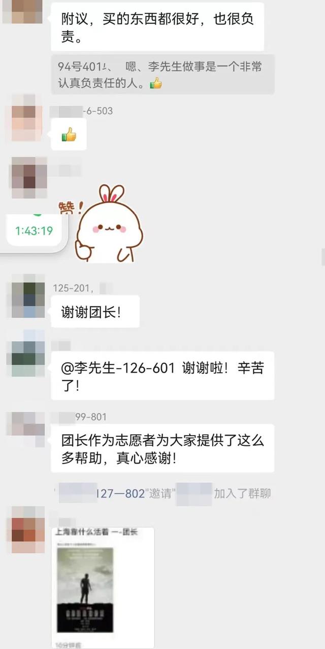 居民下楼领物资,见了面,他们会说“辛苦了”。有的会发朋友圈,说要不是靠团长,基本上冰箱都空了,下面配个图“我的团长我的团”。我还是蛮感动的。