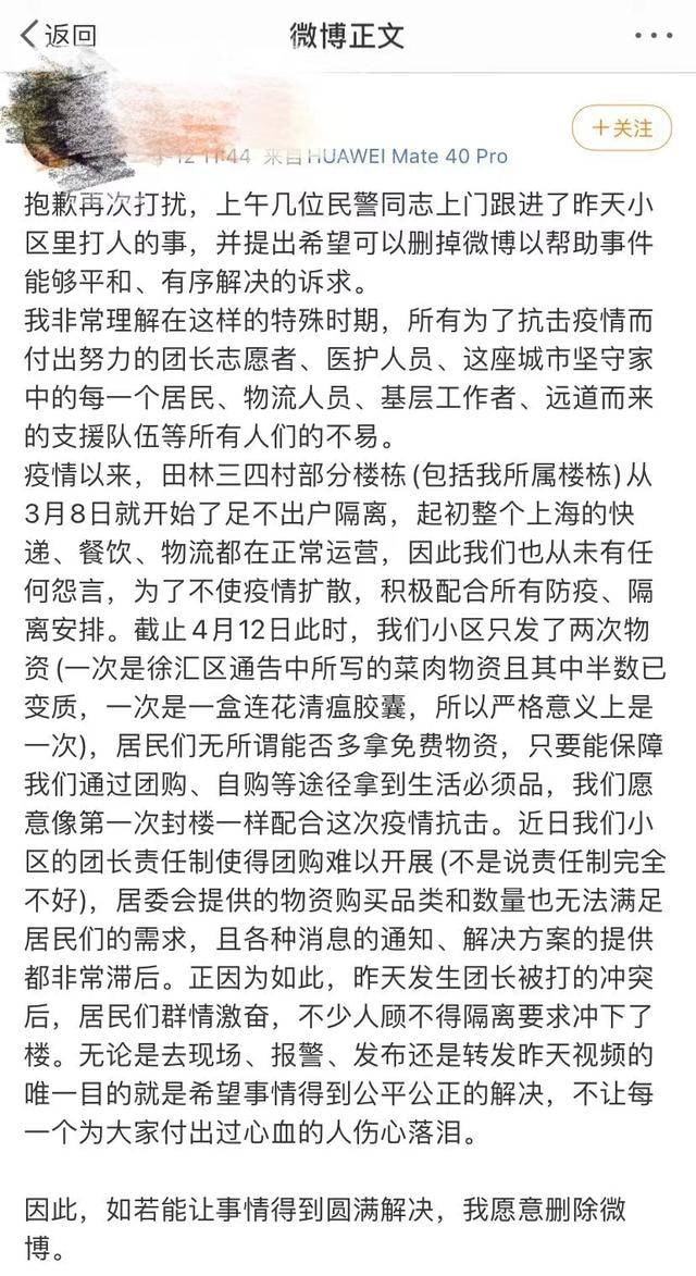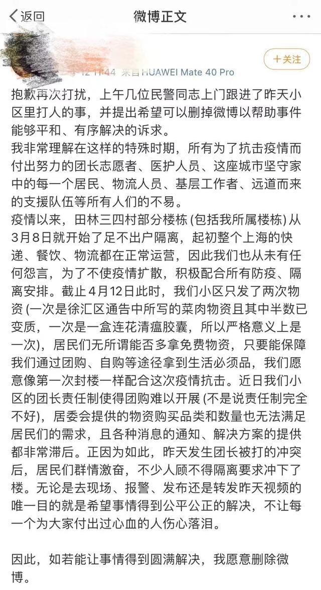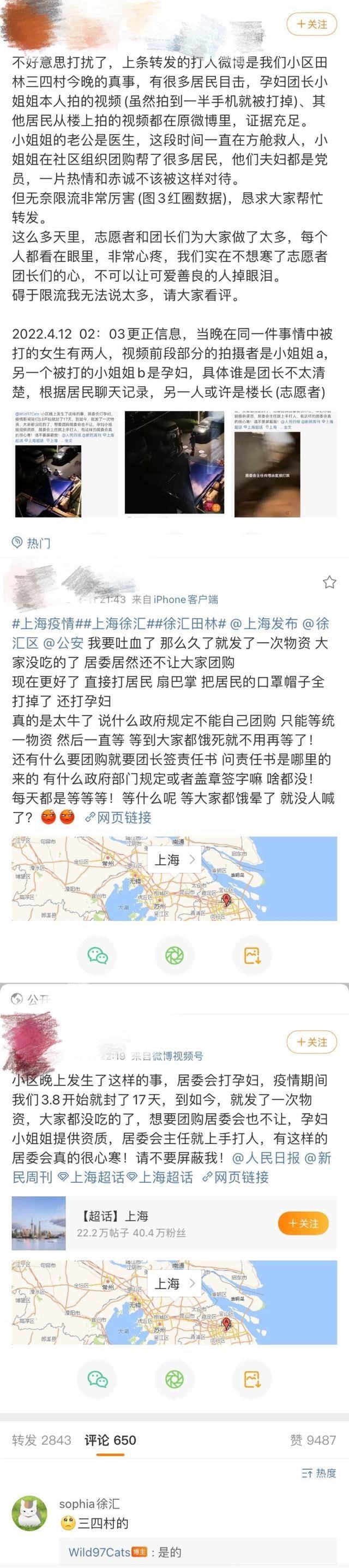 4月11日晚,有多名自称上海田林三四村的小区居民发文称居委会工作人员殴打两名女子,并贴有相关图片。