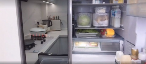 这大冰箱居然是个镜面,整整齐齐的厨房一览眼底。这只是冰箱的一角,清晰可见的乳酸菌和彩椒以及新鲜的绿叶菜,你以为这就完了?