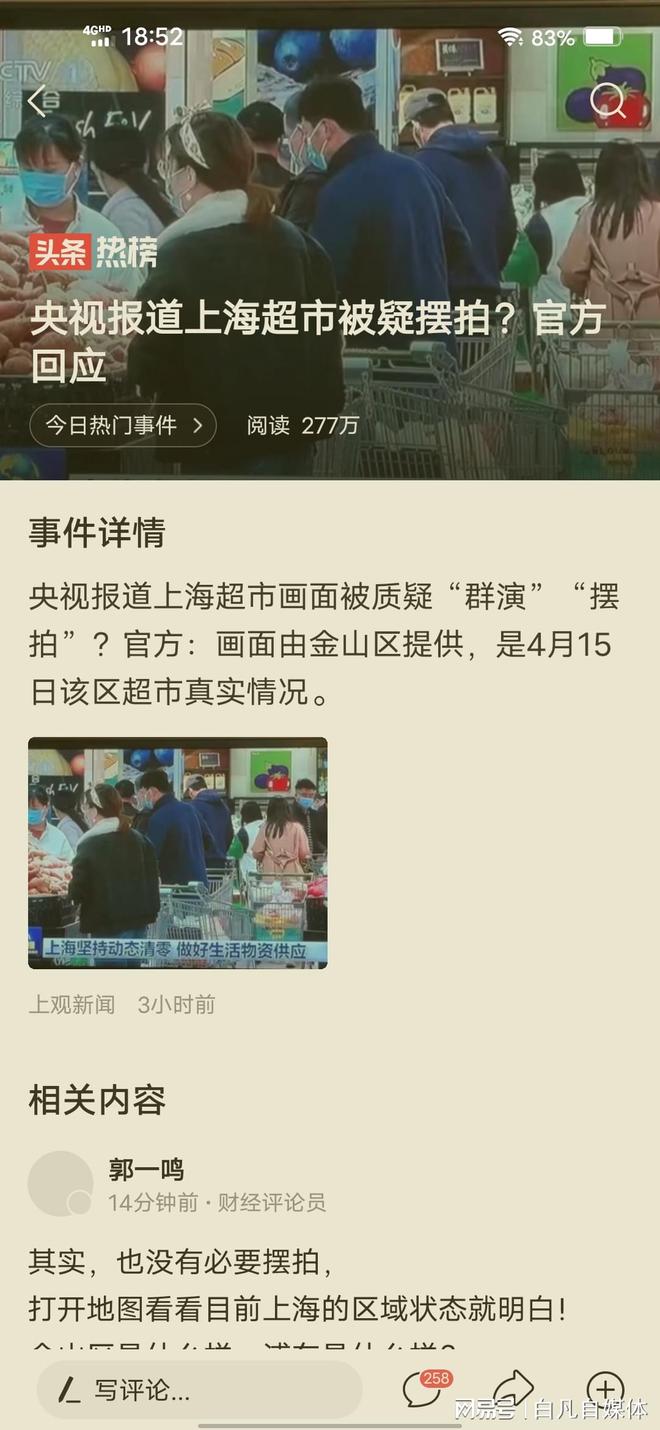 央视报道上海超市被疑摆拍?官方回应#新闻可分为局部真实和全局真实,有时候在当地看起来是真的,但在全面报告中也是误导。举个简单的例子,在特别贫穷的国家,比如非洲,有富人。如果媒体把焦点放在这些富豪家庭上,把他们的生活报道成当地人的共同生活,那就不真实了。