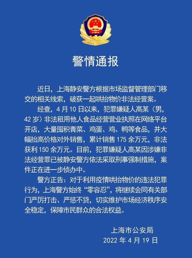 据上海警方通报,4月10日以来,犯罪嫌疑人高某(男,42岁)非法租用他人食品经营营业执照在网络平台开店,大量囤积青菜、鸡蛋、鸡、鸭等食品,并大幅抬高价格对外销售,累计销售175余万元,非法获利150余万元。目前,犯罪嫌疑人高某因涉嫌非法经营罪已被静安警方依法采取刑事强制措施,案件正在进一步侦办中。
