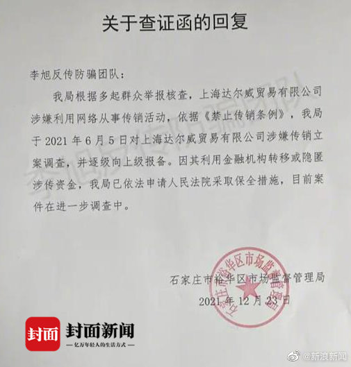 【#张庭夫妇最初举报者发声#:邪不压正】张庭和林瑞阳打造的微商帝国吸金无数,两人的公司因涉嫌传销被查处而引爆网络。目前,张庭夫妇公司名下96套房产被查封。最早就张庭涉嫌传销向市场监督管理局发起问询的,是李旭反诈骗团队。4月22日,封面新闻记者采访了李旭反诈骗团队负责人李旭,对方坦言:关于此事,他和团队现在也有一些压力,“因为毕竟有的事情并不是我们能够左右的,目前主要是执法部门的事情。”