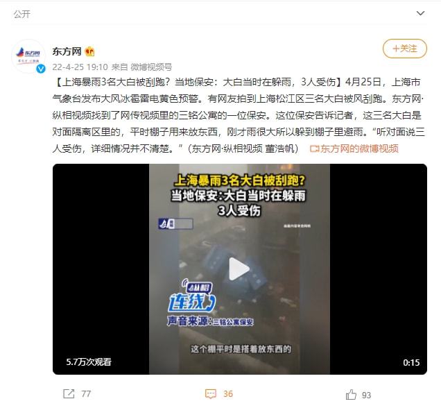 【上海暴雨3名大白被刮跑?当地保安:大白当时在躲雨,3人受伤】4月25日,上海市气象台发布大风冰雹雷电黄色预警。有网友拍到上海松江区三名大白被风刮跑。东方网·纵相视频找到了网传视频里的三铭公寓的一位保安。这位保安告诉记者,这三名大白是对面隔离区里的,平时棚子用来放东西,刚才雨很大所以躲到棚子里避雨。“听对面说三人受伤,详细情况并不清楚。”(东方网·纵相视频 董浩帆)