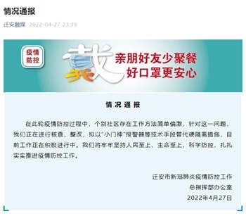 迁安融媒微信公众号27日消息,河北迁安就个别社区防疫工作方法简单、偏激发布情况通报,表示正在核查、整改。