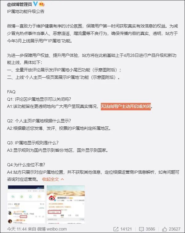 4月28日,新浪微博社区管理官方微博发布IP属地功能升级公告:
