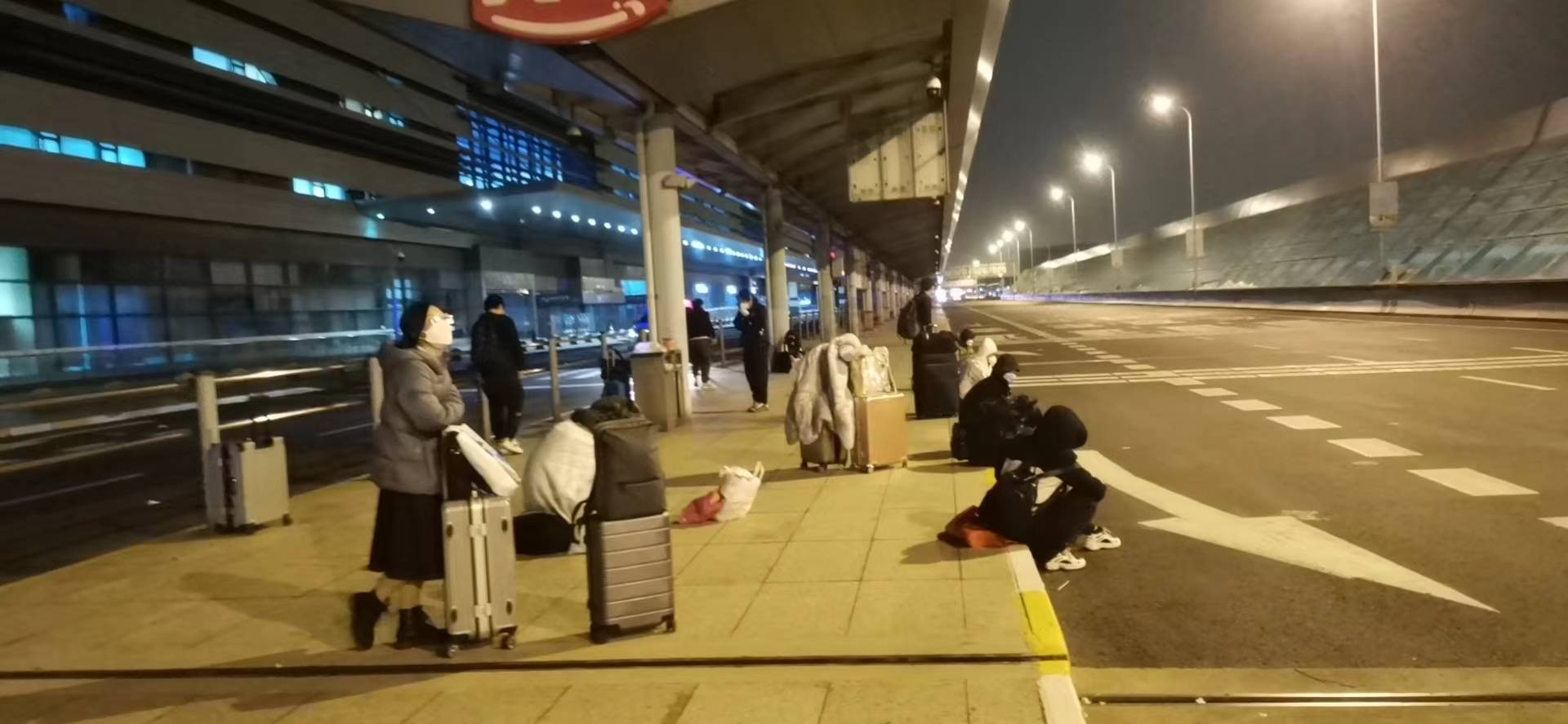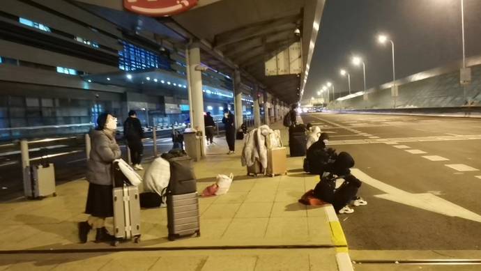 从25日开始,我已经在虹桥停留两天了。白天我们可以进去高铁站的大厅,里面有一个休息的地方,就是几个椅子和充电口,你可以在那里休息、给手机充电,但是到了晚上就得出来。所以晚上我在外面睡桥洞。我还好,只有一个书包,比较轻松,好多人行李特别多,非常不方便。