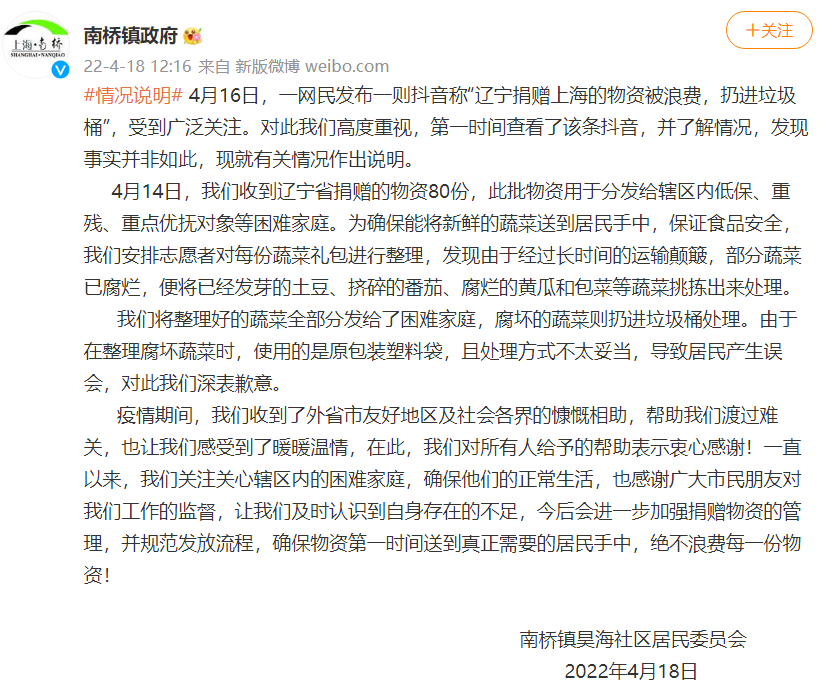 4月16日,一网民发布一则抖音称“辽宁捐赠上海的物资被浪费,扔进垃圾桶”,受到广泛关注。