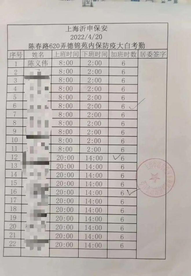 在德锦苑4月5日的“内保防疫大白考勤表”上,加班时数一栏由12小时改为6小时。每日考勤表上均盖有上海市浦东新区北蔡镇陈桥居民委员会的公章。