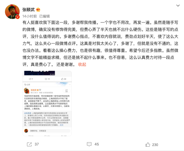 很快,张颐武又发了第二条微博作为回应,他说:“古人有一字师,现在是微博有一百多字师。劳神费力,辛苦得很,点点划划,真是勤奋极了,对着一段微博真是努力。可惜也还是没什么大毛病。都知道其实是不喜欢内容,但这么费心费力,也可贵得紧。还得谢谢。有这百字师这么操心指点,我觉得更得多写点微博,让人有机会奋力指点一下,大家都挺高兴。”