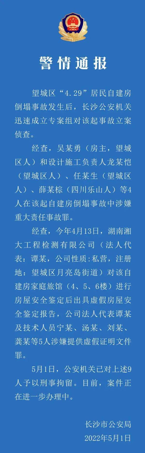 长沙警方1日通报,长沙市望城区“4.29”居民自建房倒塌事故发生后,长沙公安机关迅速成立专案组对该起事故立案侦查。