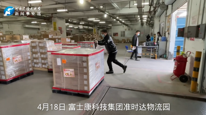 在富士康科技集团准时达物流区,这里物流车辆正常出入装卸货。富士康科技集团准时达物流经理李俊强表示,“在目前疫情的状况下,从国内交货和国外进口的货物,采用提前理货、消杀、核酸采样。在确保核酸采样没有问题的情况下,再发放到生产单位。”