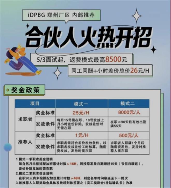 每经小编注意到,“富士康iDPBG郑州招募”微信公众号近日发布消息, 郑州富士康iDPBG事业群合伙人火热招募中,自5月3日面试起,返费模式最高8500元,同工同酬+小时差价总价一小时26元。