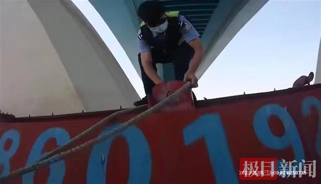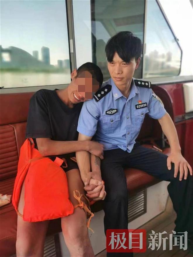见男子情绪激动,张胜不停安抚,并搀扶其坐下,发现其身上有多处伤口。随后登上桥墩的李博,将自己的衣物脱下,给男子穿上。待男子情绪有所平复后,民警利用梯子将他安全转移到艇舱内。