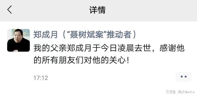 “我的父亲郑成月于今日凌晨去世,感谢他的所有朋友们对他的关心!”