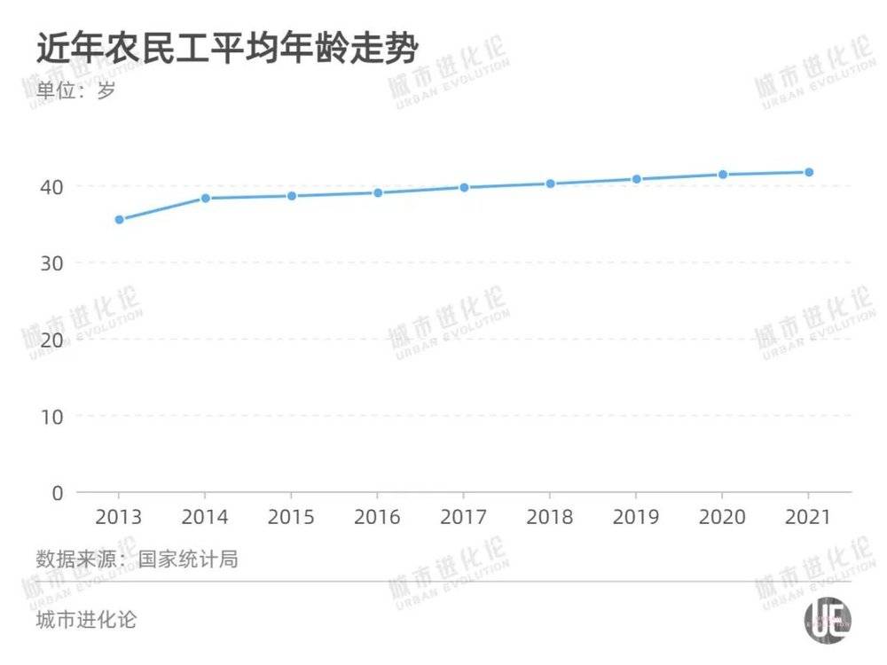 整体来看,全国农民工的平均年龄逐年提高。2013年农民工平均年龄35.5岁,2021年已经达到41.7岁。