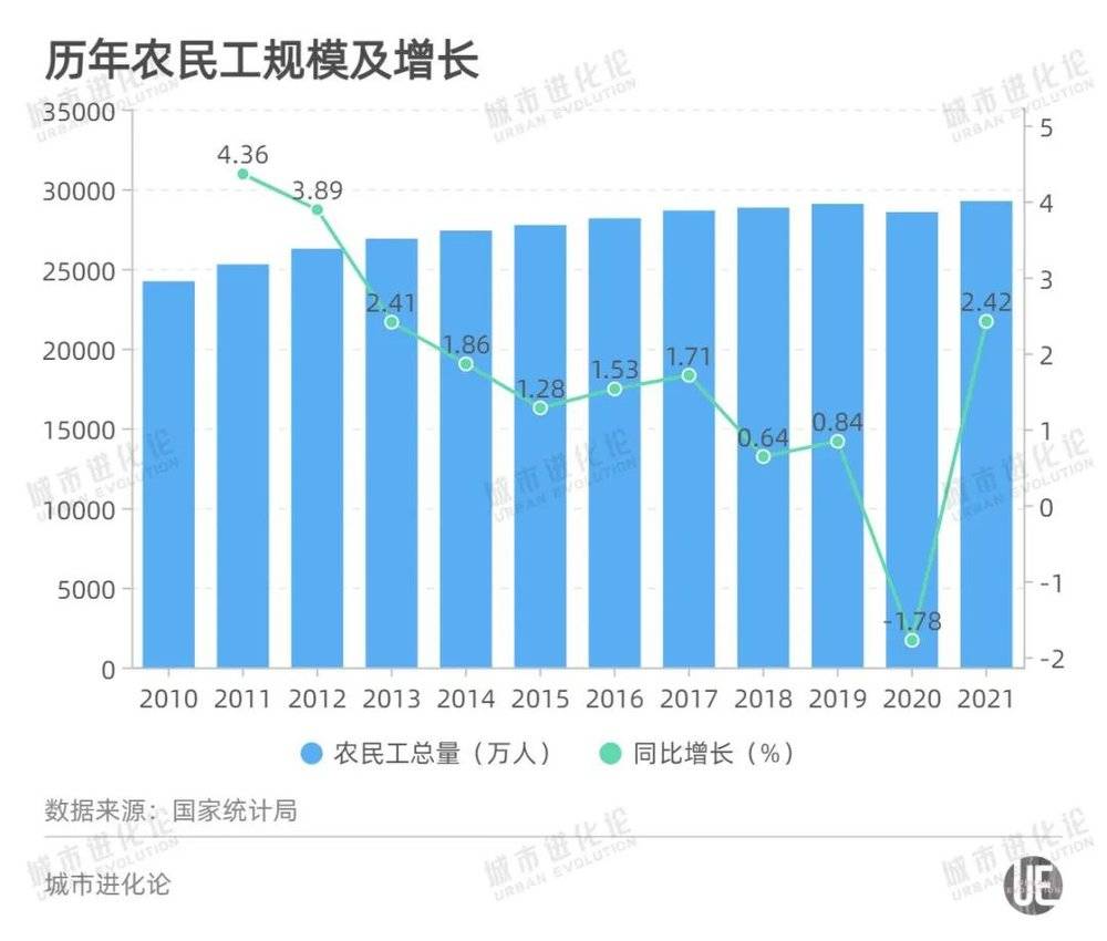 总体来看,我国农民工总量从2010年的2.42亿人,一路增至2019年的2.91亿人,2020年疫情之下稍有回流,2021年离开了农村、离开了田地的人又恢复到2.93亿的水平。