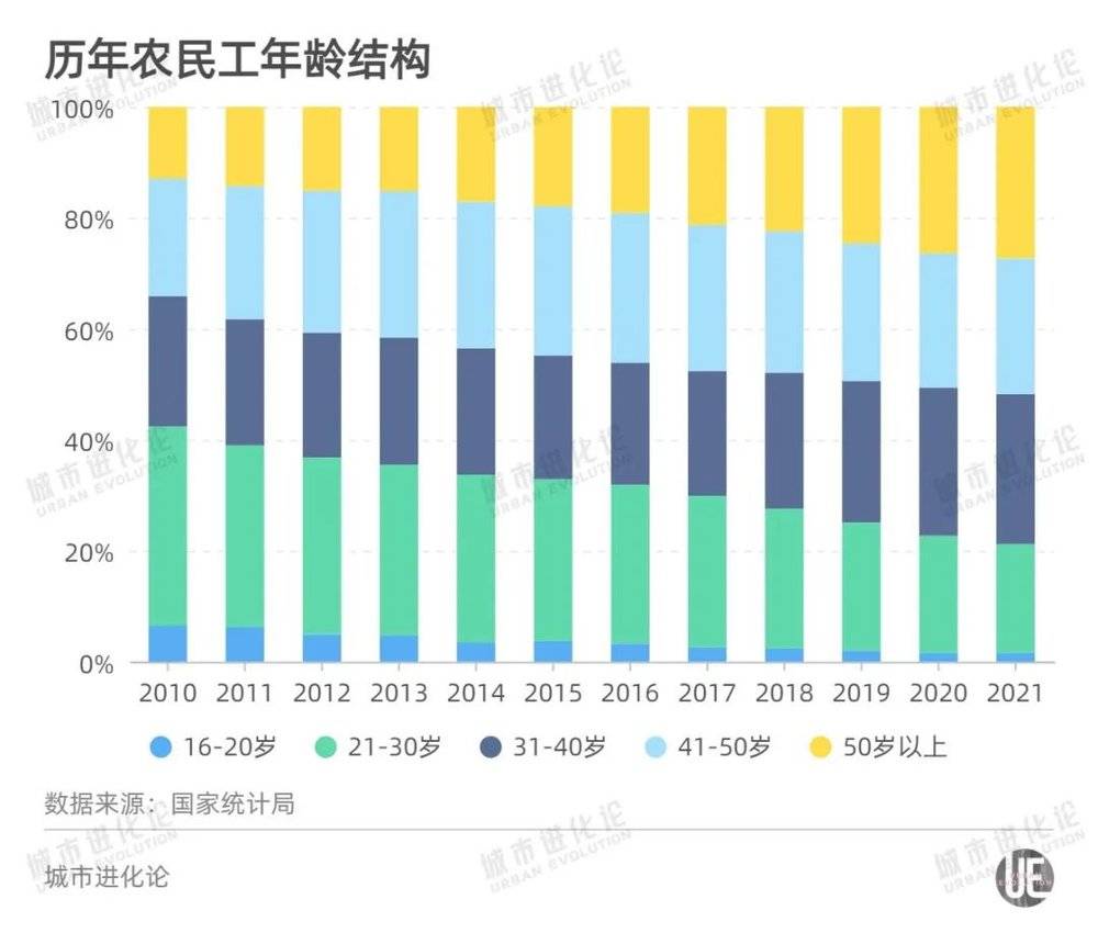 与之形成对比的是,21~30岁农民工占比不断下降。2010年这群年轻农民工占比尚有35.9%,近年来一路缩减,2021年其占比首次跌破20%,只剩19.6%。