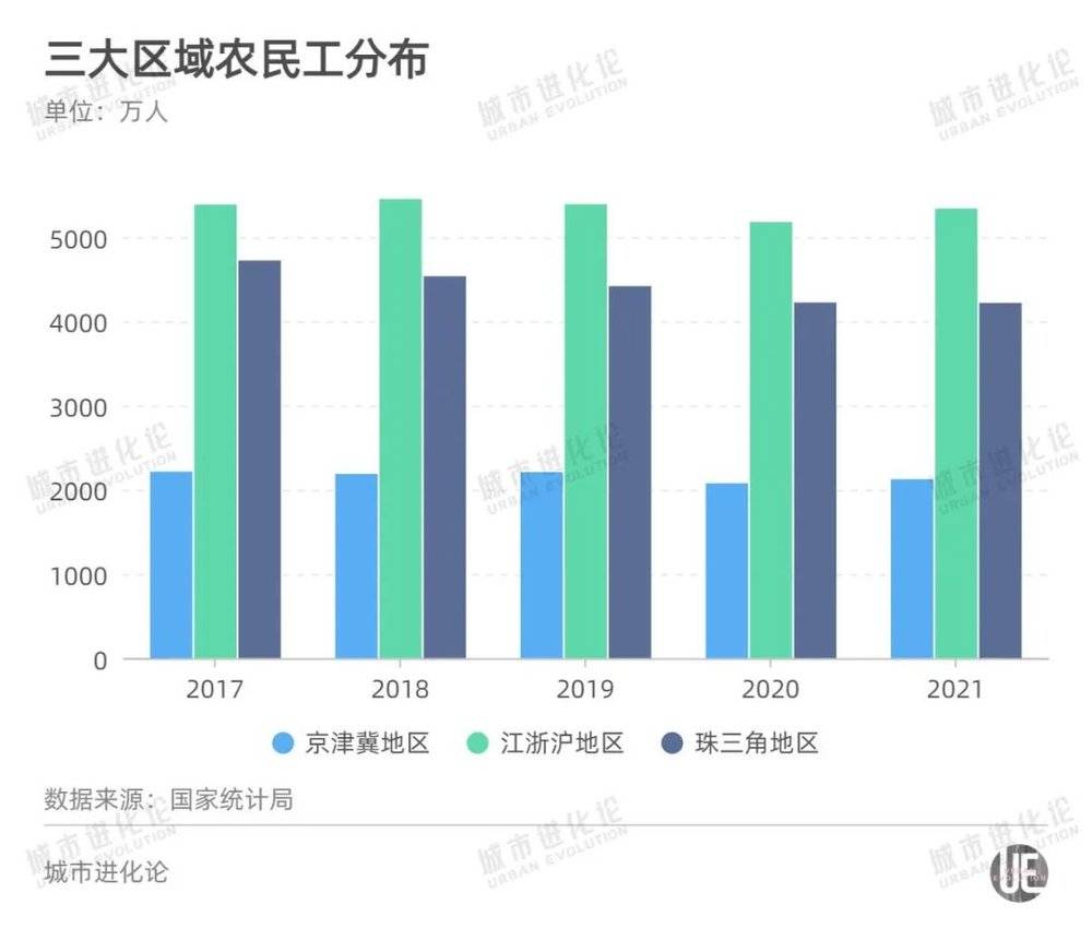 珠三角地区尤其突出,2017年在珠三角地区的农民工尚有4722万人,4年减少逾500万,2021年为4219万人。