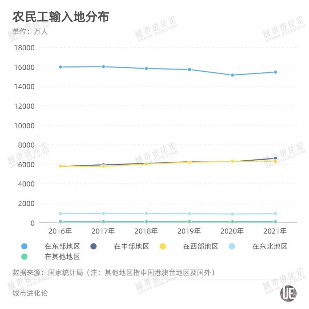 历年的报告一直在打破“孔雀东南飞”的印象。仅看2016年到2021年,以京津冀、江浙沪、珠三角为代表的东部地区,虽然吸纳了过半的农民工,但其总量已从15960 万人减少到15438万人,占比也从56.65%降至52.78%。