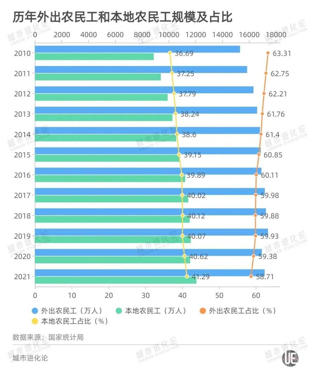 2021年的2.93亿农民工,41.29%是本地农民工,58.71%是外出农民工。