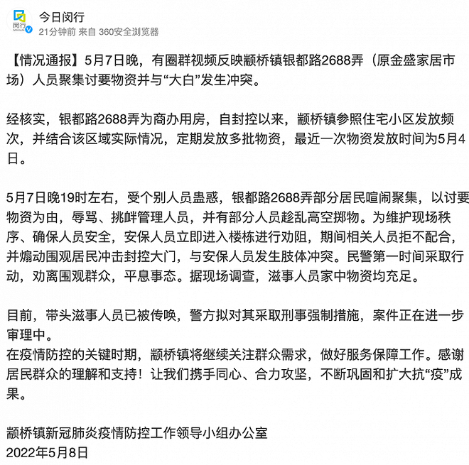 据@今日闵行 微博消息,颛桥镇新冠肺炎疫情防控工作领导小组办公室8日发布情况通报称,5月7日晚,有圈群视频反映颛桥镇银都路2688弄(原金盛家居市场)人员聚集讨要物资并与“大白”发生冲突。