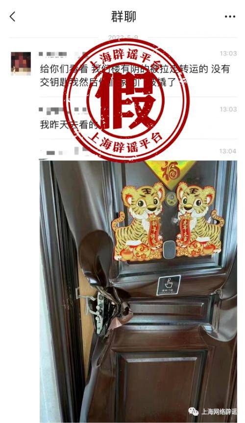 上海辟谣平台获悉,网传信息不实。据属地公安部门核查,该防盗门损坏的图片系黄浦区一楼宇内的408室,拍摄者为同楼内的608室业主。608室业主于5月9日13时许将现场图片发布于微信群内,并发表“我们楼有阴的被拉走转运的,没有交钥匙然后他们家里的门被撬”的言论。该言论是其猜测,并无实际依据。经调查,408室防盗门损坏情况实际上是该户业主4月底下楼核酸期间忘带钥匙,后联系消防破门,导致防盗门损坏。