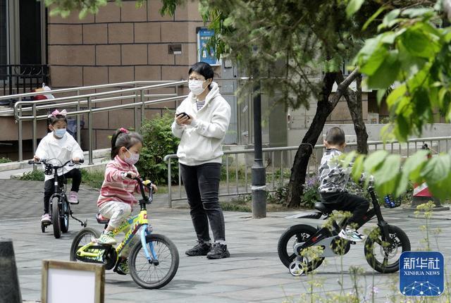 5月9日,孩子们在朝阳区一个小区内的公共绿地玩耍。