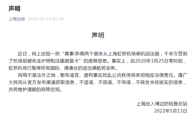 近日,网上出现一则“真事:昨晚两个朋友从上海虹桥机场乘机回法国,千辛万苦到了机场却被收走护照和法国居留卡”的虚假信息。事实上,自2020年3月25日零时起,虹桥机场已暂停所有国际、港澳台的进出港航班业务。