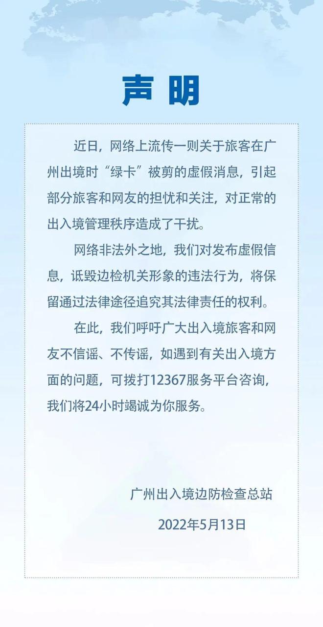 近日,网络上流传一则关于旅客在广州出境时“绿卡”被剪的虚假消息,引起部分旅客和网友的担忧和关注,对正常的出入境管理秩序造成了干扰。