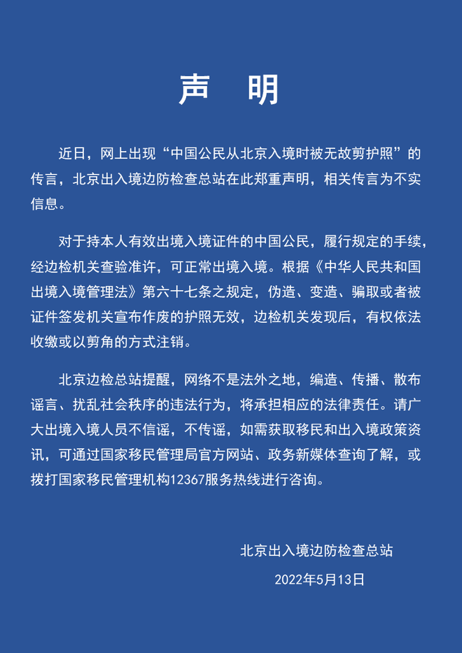 近日,网上出现“中国公民从北京入境时被无故剪护照”的传言,北京出入境边防检查总站在此郑重声明,相关传言为不实信息。