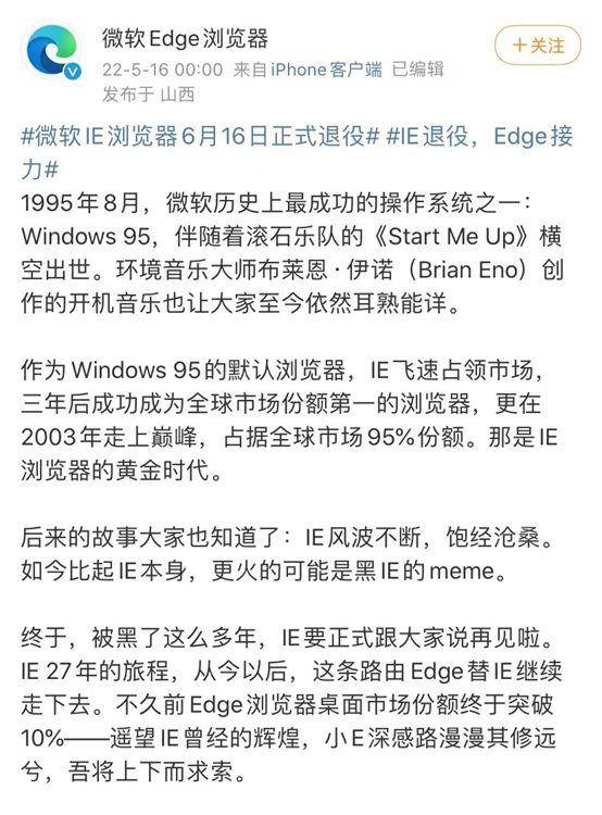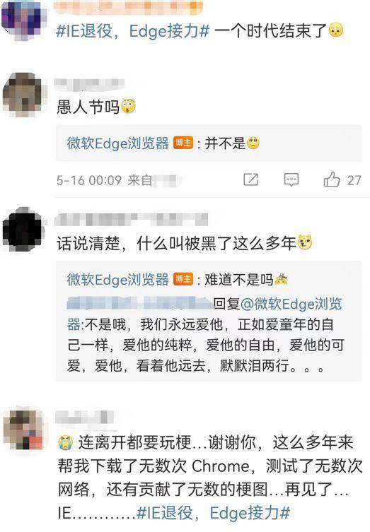“终于,被黑了这么多年,IE要正式跟大家说再见啦。” 微软Edge浏览器的官方微博于5月16日0点发文官宣,微博提及,IE 27年的旅程,从今以后,这条路由Edge替IE继续走下去。