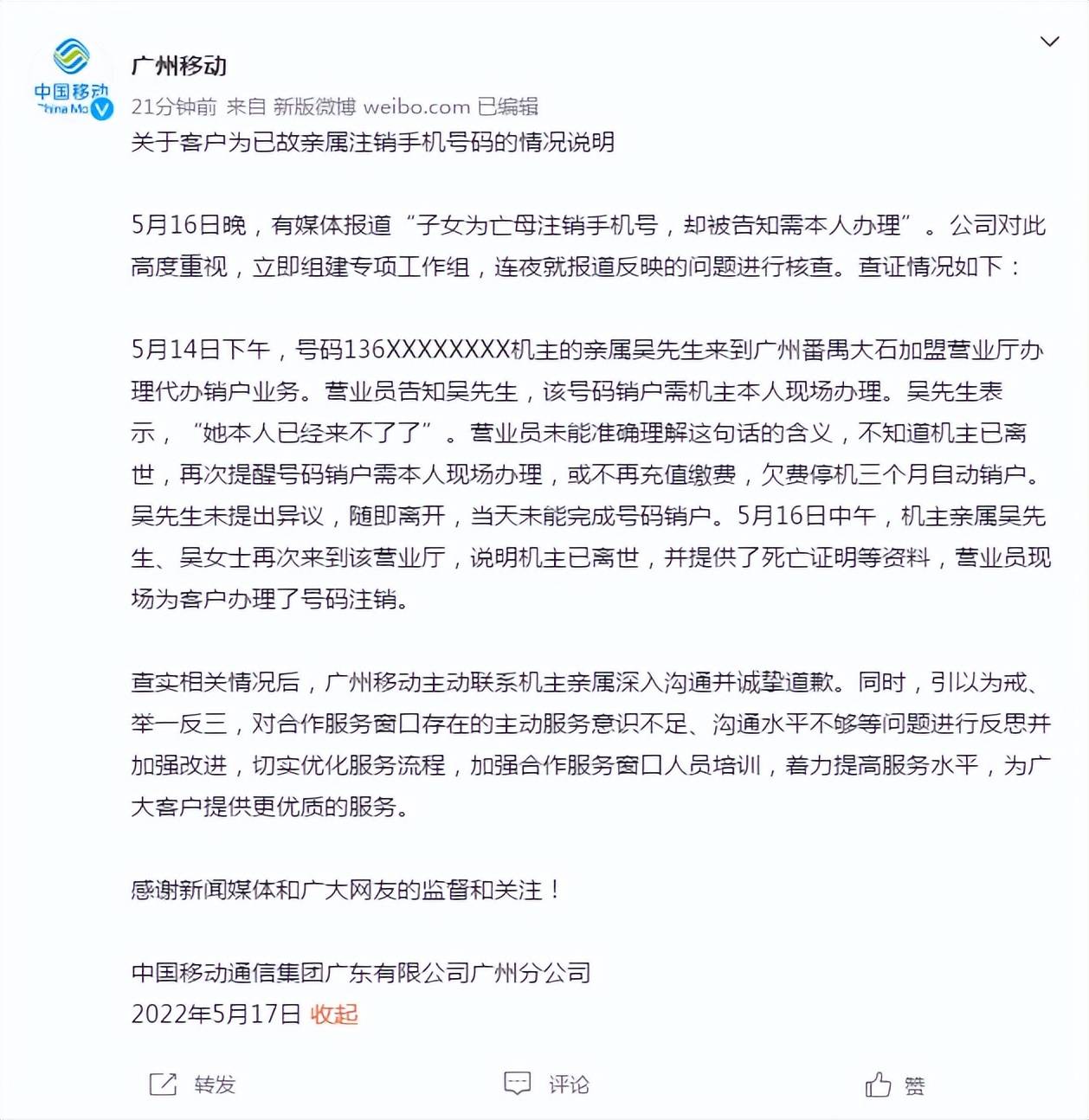 据广州移动官方微博消息,5月16日晚,有媒体报道“子女为亡母注销手机号,却被告知需本人办理”。公司对此高度重视,立即组建专项工作组,连夜就报道反映的问题进行核查。在查实相关情况后,广州移动主动联系机主亲属深入沟通并诚挚道歉。